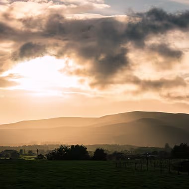 Sunset over rural landscape with rolling hills in the background. The sky was filled with dramatic clouds, casting a warm golden glow over the fields and scattered trees.