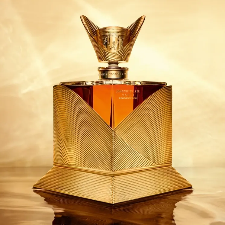 A luxurious gold bottle of Johnnie Walker Blue Label whisky with an intricate, textured design, set against a warm, golden background.