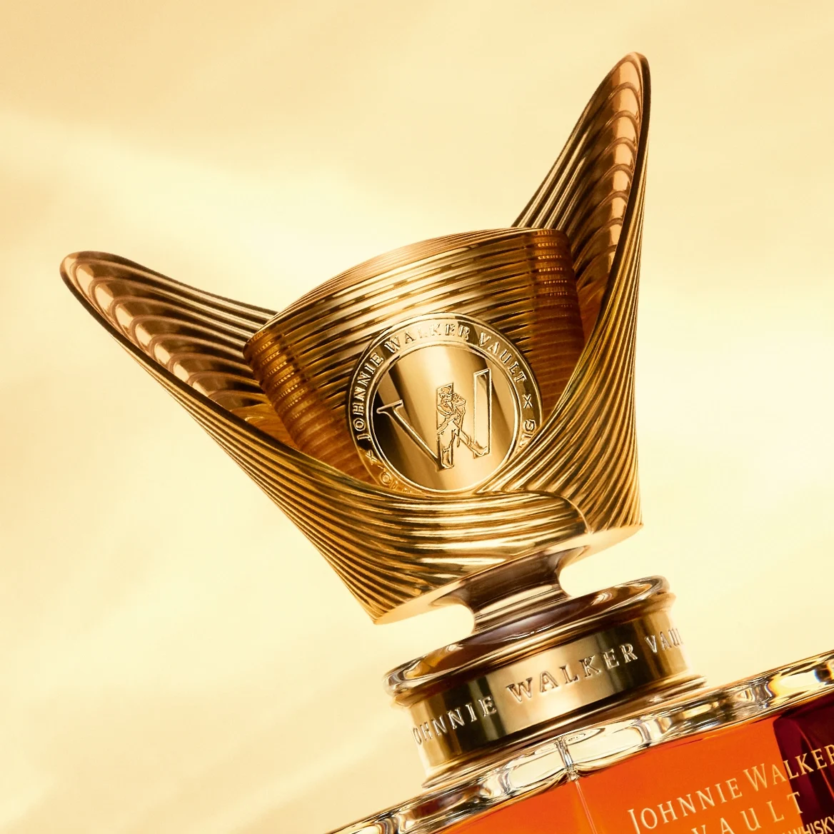 Close-up of a luxurious Johnnie Walker whisky bottle cap, featuring an ornate golden design with spiral elements and the Johnnie Walker logo embossed in the center, set against a warm, golden background.